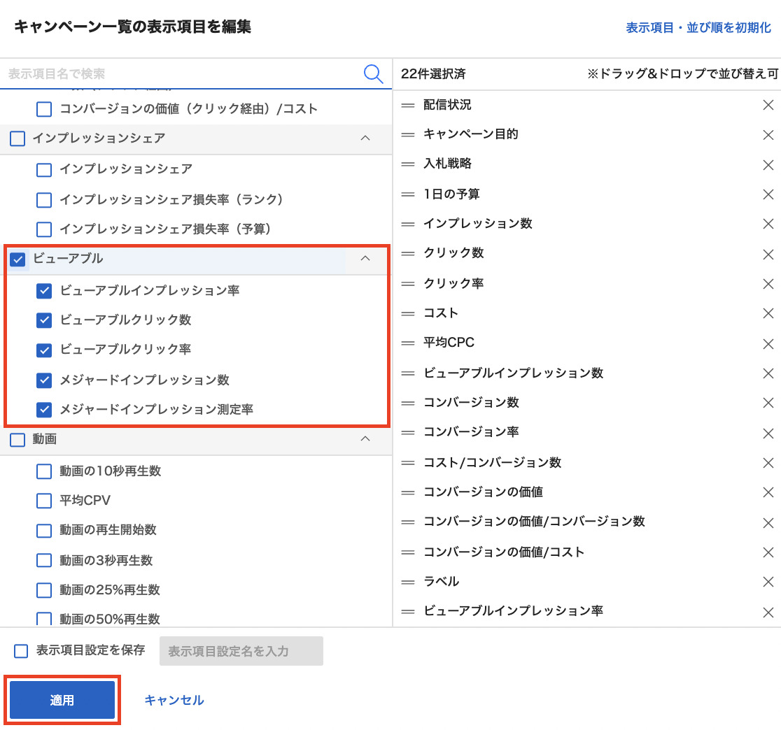 「ビューアブル」の項目からビューアブルインプレッション関連の指標を選択し適応をクリックしたら完了です。