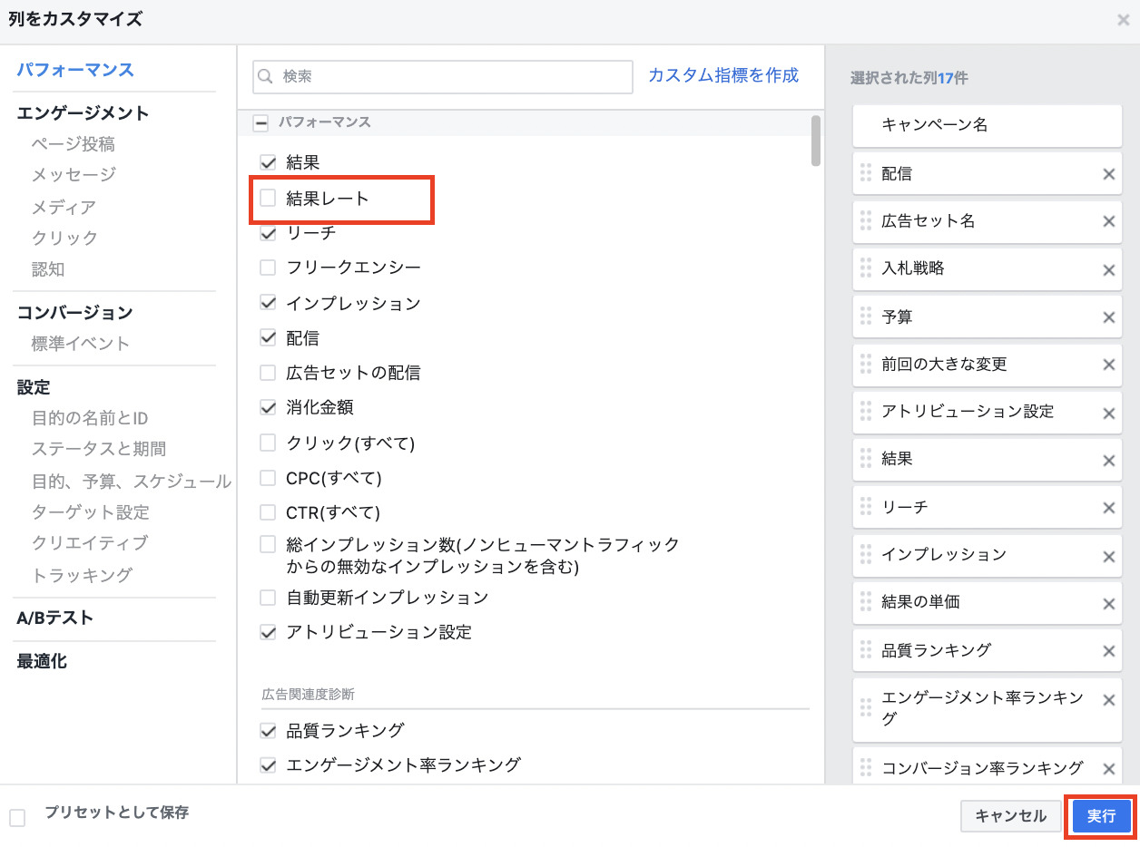 「パフォーマンス」の項目から「結果レート」にチェックして実行をクリックしたら完了です。