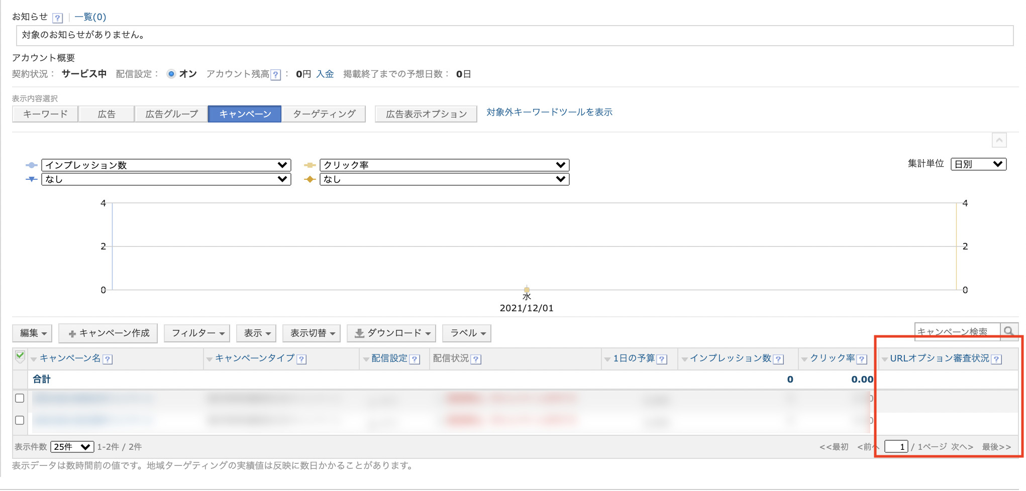 URLオプション審査状況は、トラッキングURLおよびカスタムパラメータの審査状況を確認できる表示項目です。