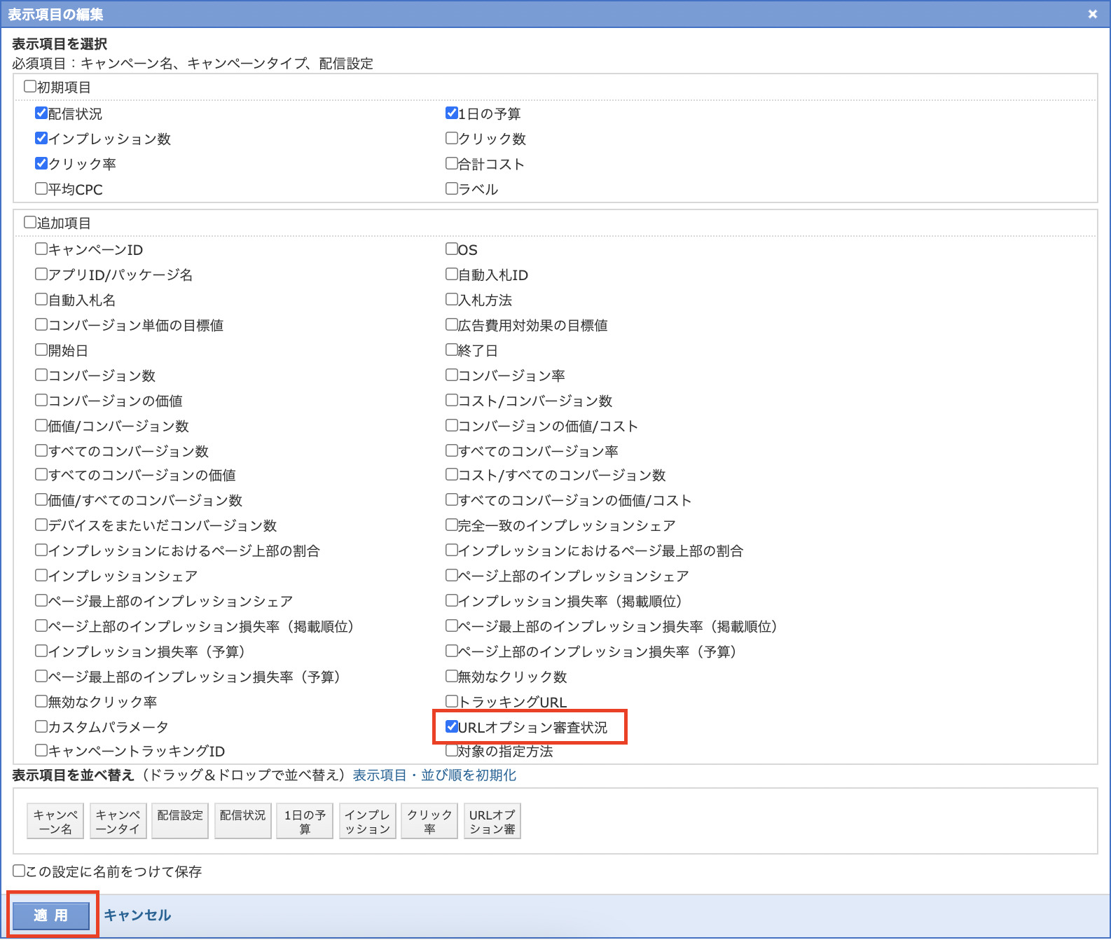 「表示項目の編集」画面から「URLオプション審査状況」のチェックボックスにチェックを入れて「適用」をクリックし完了です。