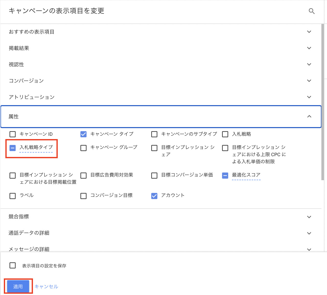 「属性」から「入札戦略タイプ」を選択し「適応」をクリックすることでレポートに表示されます。