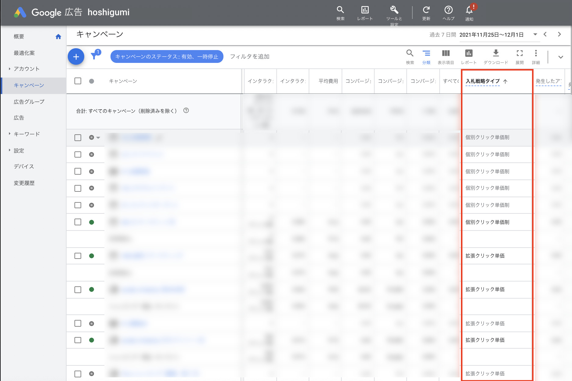 「入札戦略タイプ」列には、ポートフォリオ入札戦略でない場合でもキャンペーンの入札戦略が表示されます。この列は、キャンペーンでポートフォリオ入札戦略を使用している場合にのみ挿入されます。