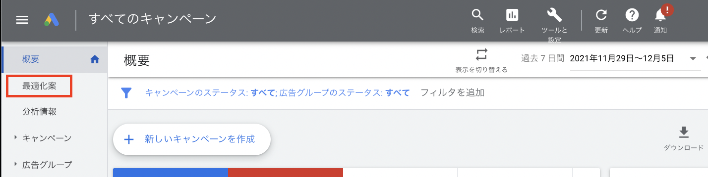 Google広告を開き左側ツールの「最適化案」をクリックします。