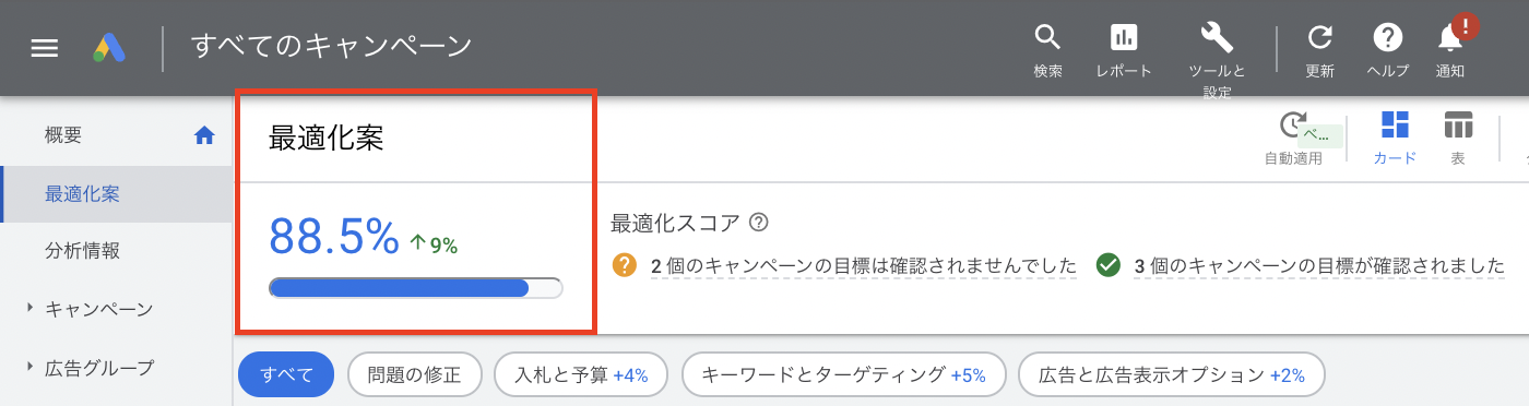 その最適化案とは、新しい関連機能を紹介するほか、入札単価、キーワード、広告を改善して予算を効率的に活用する方法を提案し、キャンペーンの全体的な掲載結果と効率の向上を支援します。各最適化案は、その案を適用したときの最適化スコアの影響をパーセンテージで示します。