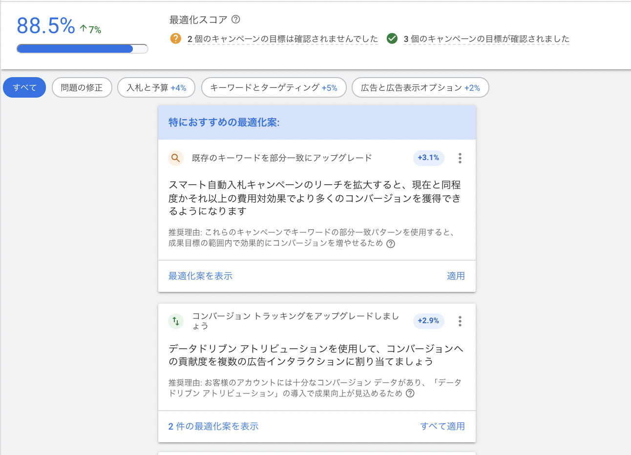 これらの最適化案を適用または非表示にすると、アカウントの全体的な最適化スコアが変更されます。