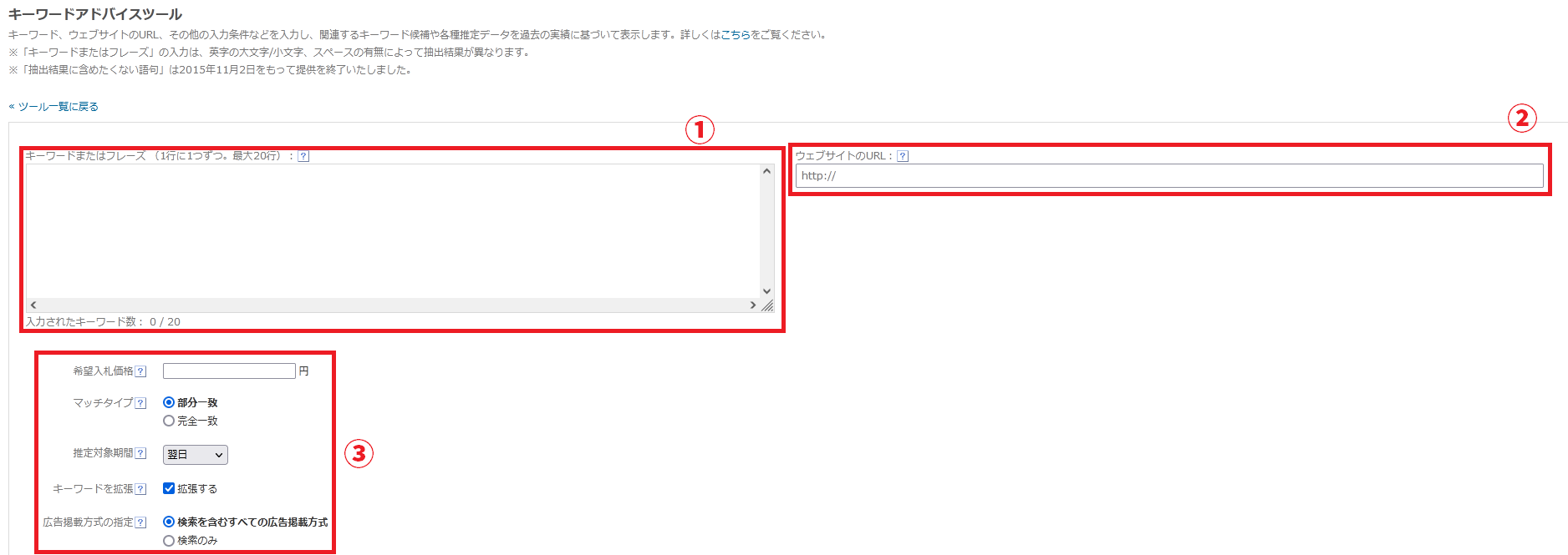 キーワードアドバイスツールに入力した単語のデータ量が少ない場合、十分なデータが表示されない可能性があります。