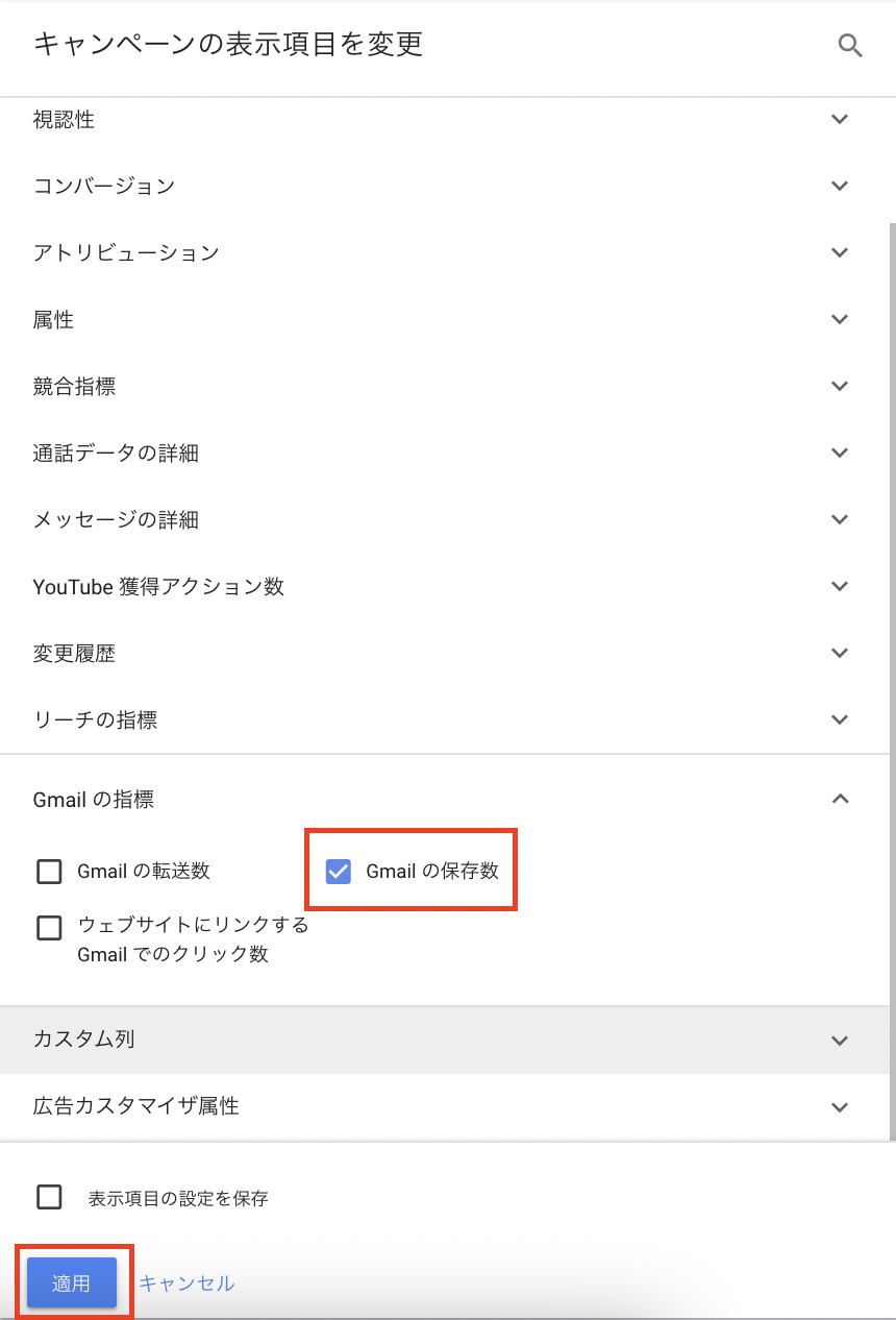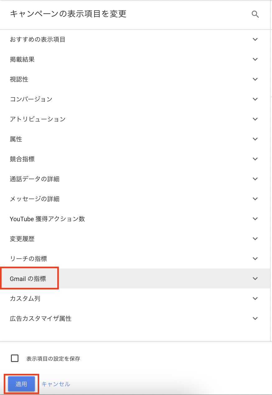 キャンペーンの表示項目の変更から「Gmailの指標」をクリックします。