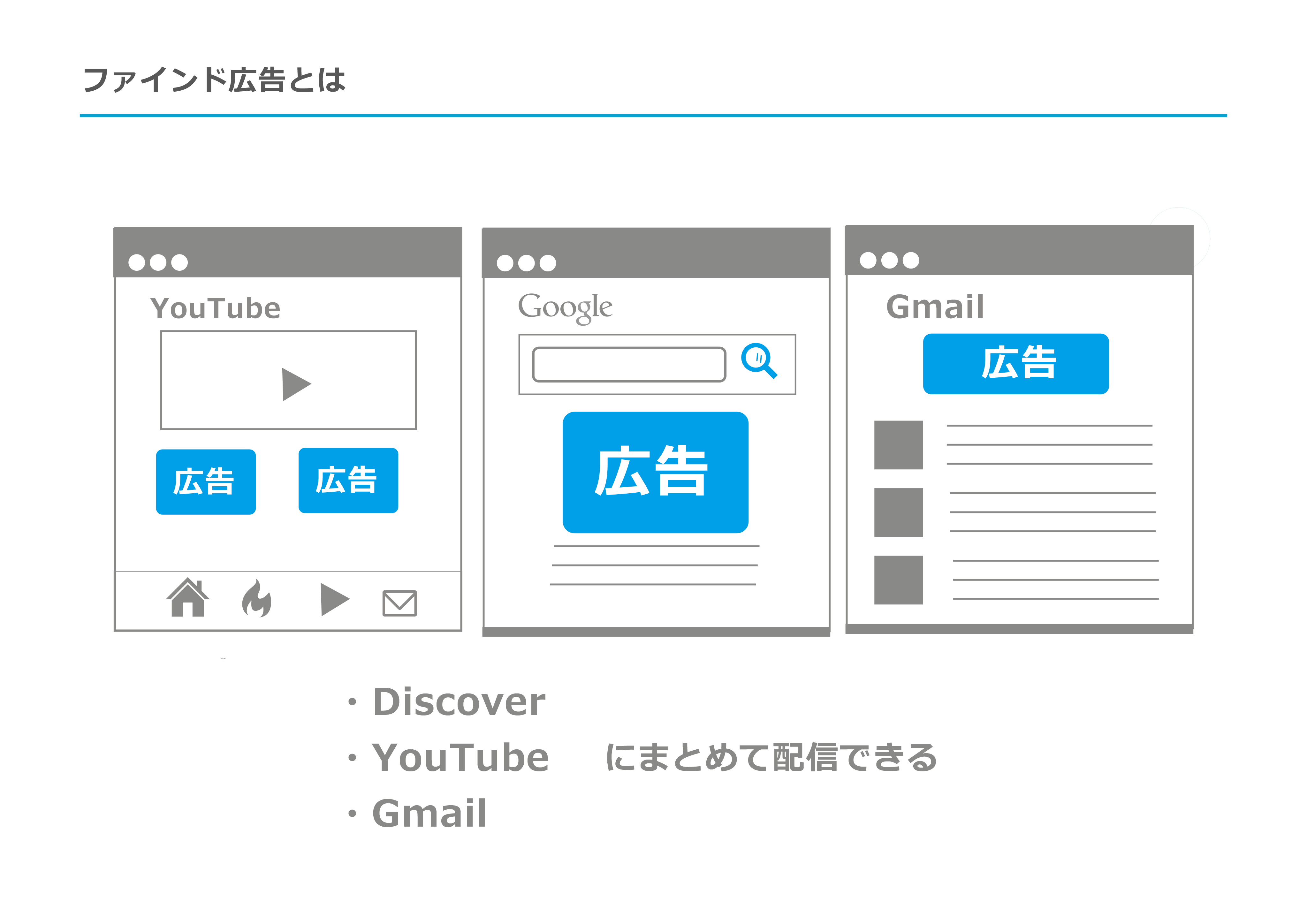Googleディスプレイ広告(GDN)の一種でGmailやYoutube Home Feed、Discoverに広告を表示できる広告表示サービスです。それらのディスプレイに個人の検索履歴や動画の視聴履歴に基づいた個別化された関連性の非常に高い広告をフィード形式で配信することができます。