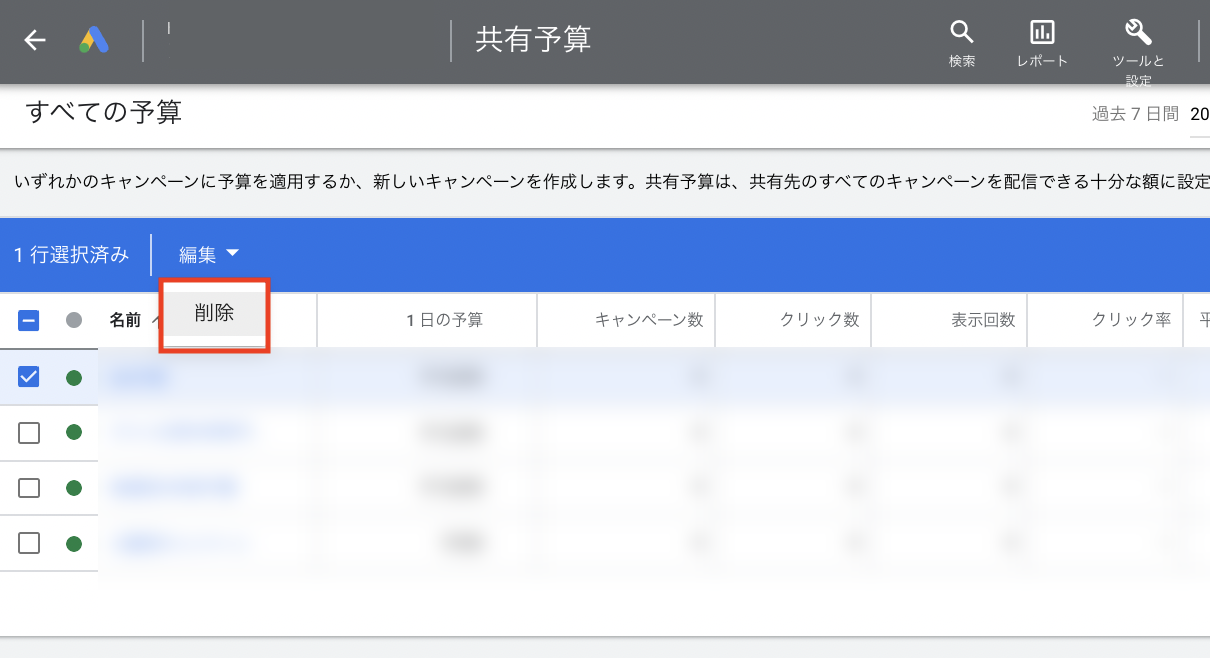 - すべてのキャンペーンが個別予算に切り替わったことを確認してから、不要になった共有予算を削除します。