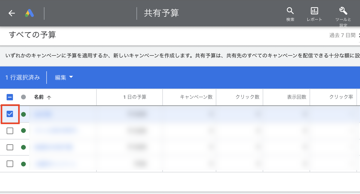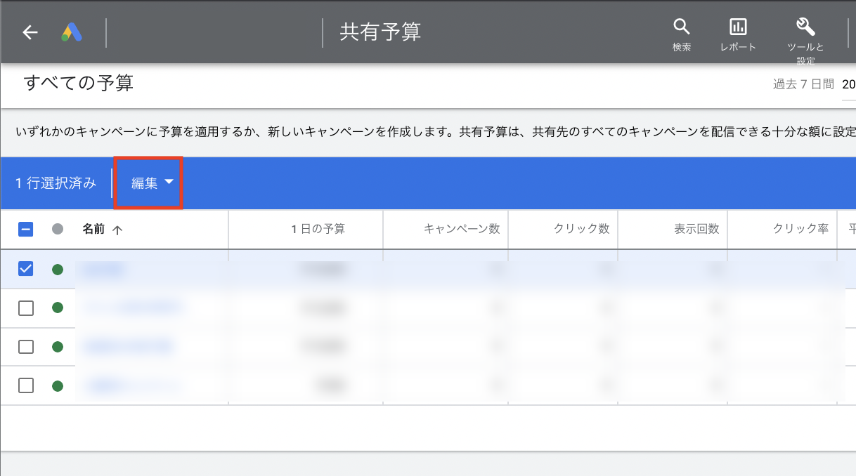 - Google広告のキャンペーン一覧画面で、該当の共有予算グループに絞り込みます。