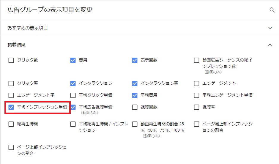 レポートに表示する指標の一覧から平均インプレッション単価を選択し、レポート列に表示しましょう。