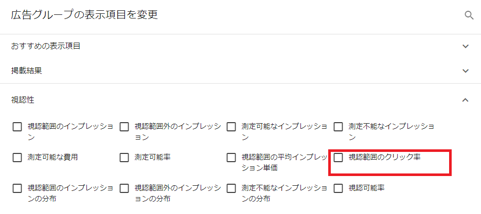 レポート列への表示項目の変更画面から視認性一覧を表示し、視認範囲のクリック率を選択しましょう。