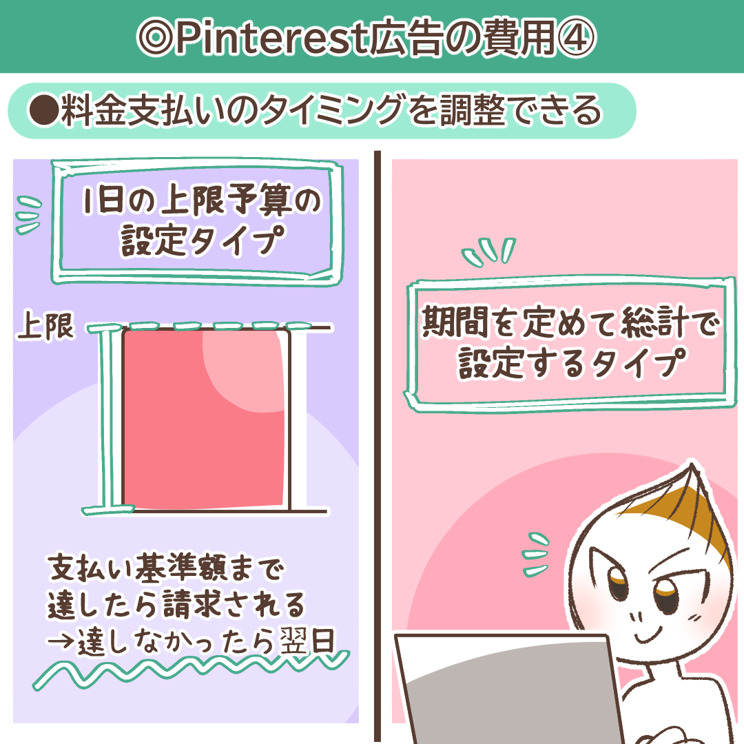 Pinterest広告では、「日予算」または「通期予算」のいずれかを選択して予算を管理します。支払いは、広告費が発生して「支払い基準額」に達するか、月末を迎えたタイミングで登録したクレジットカードに対して請求されます。支払い基準額は最初は低く設定されていますが、支払いを継続することで上限が引き上げられていきます。日予算を設定した場合、アルゴリズムは日によって設定額を多少超えて配信することがありますが、1ヶ月を通してみると「日予算×その月の日数」を超えることはありません。これにより、1日単位の細かな変動に惑わされず、月単位での予算管理が可能です。獲得効率を最大化するためには、成果の良いキャンペーンや広告グループに予算を柔軟に再配分していく運用が不可欠です。