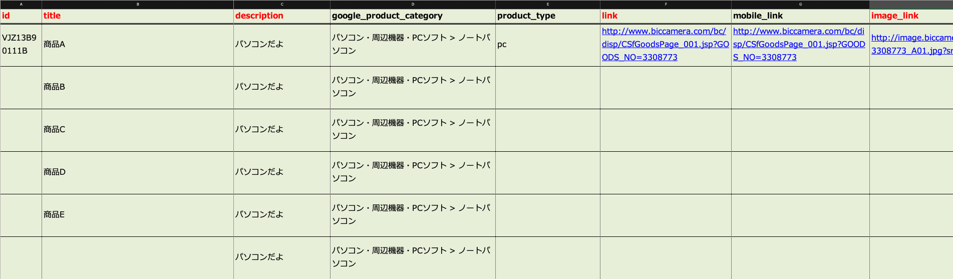 こちらはGoogle動的リマーケティングでのデータフィード例です。
