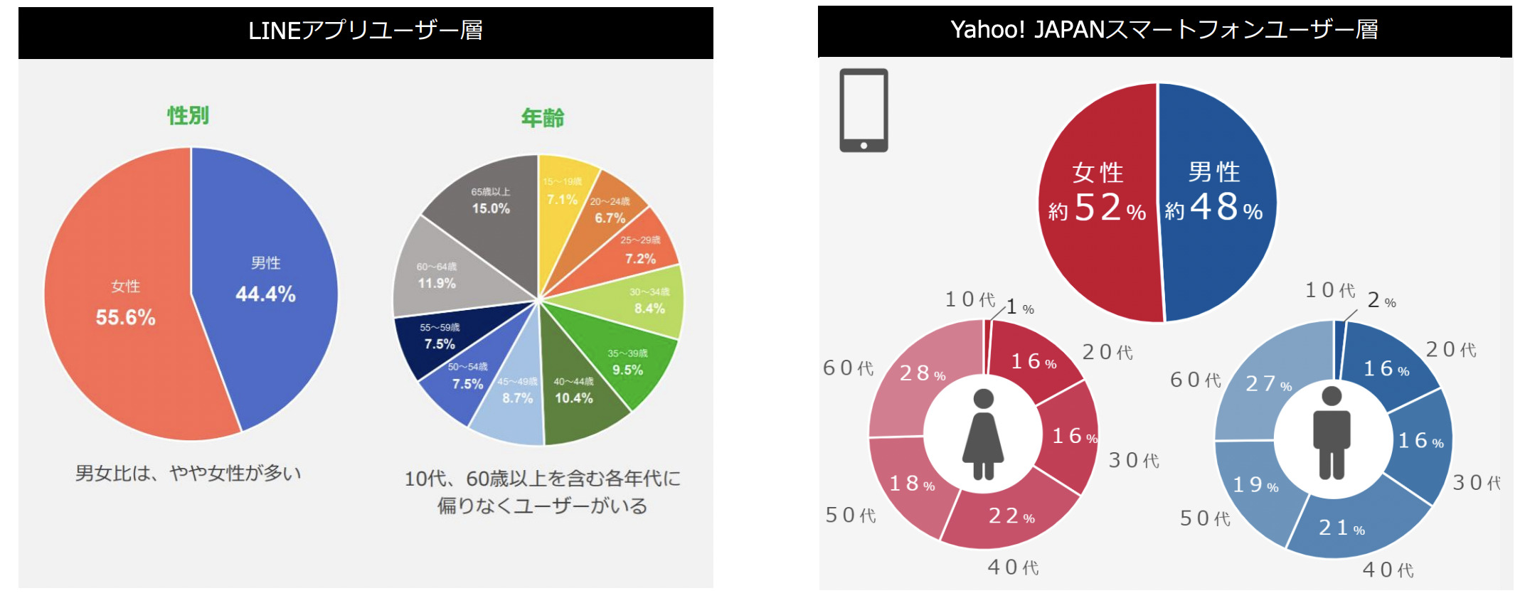 上記の頭はLINEアプリユーザーとYahoo!JAPANをスマートフォンで利用しているユーザーの性別、年代別の割合の円グラフになります。