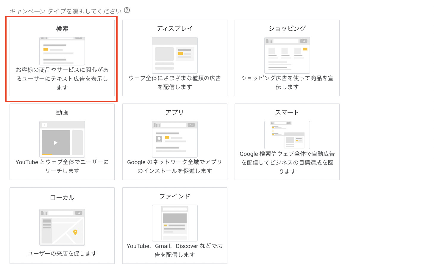 Google広告か目標インプレッションシェアを導入するキャンペーンを選択、またはキャンペーンタイプで検索広告を選択し作成します。