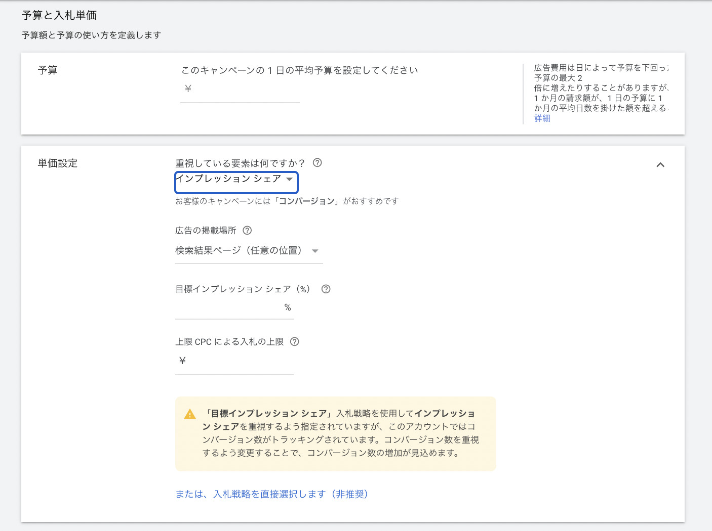 既存のキャンペーンを選択した場合は入札単価」を展開し、重要とする指標に「インプレッションシェア」を選択します。