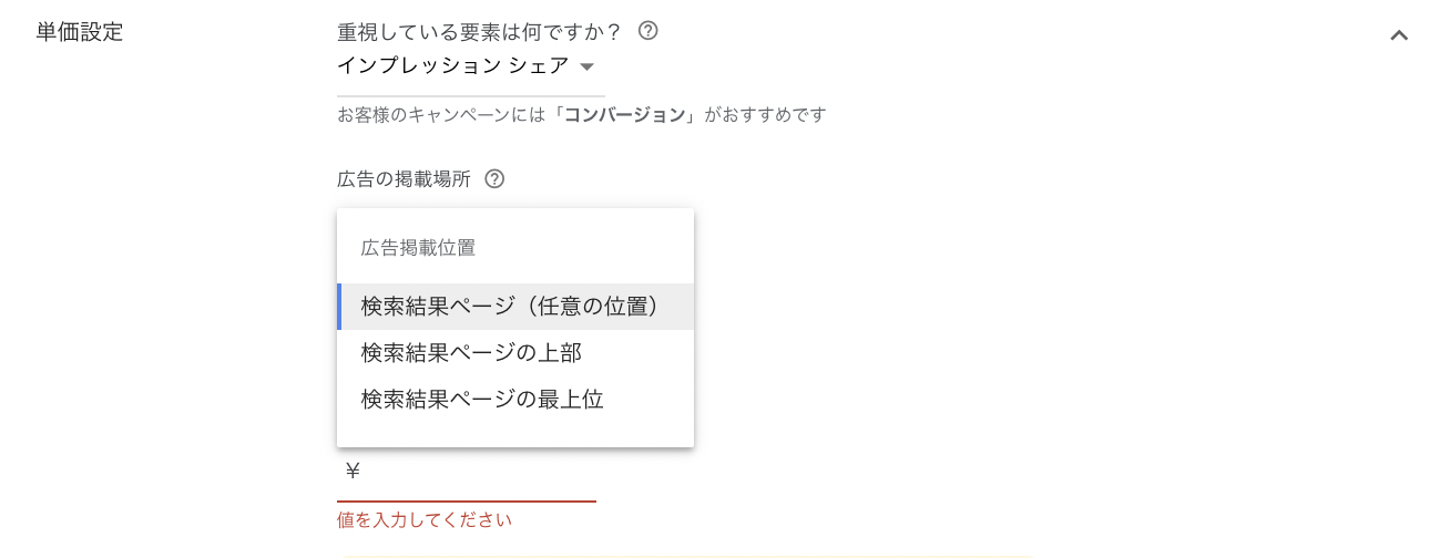 目標インプレッションシェアは表示位置を指定して入札できるようになります。「ページの最上部」「上部」「任意の場所」の3つに設定が可能になり、設定内容に基づいて自動的に入札単価が調整されます。