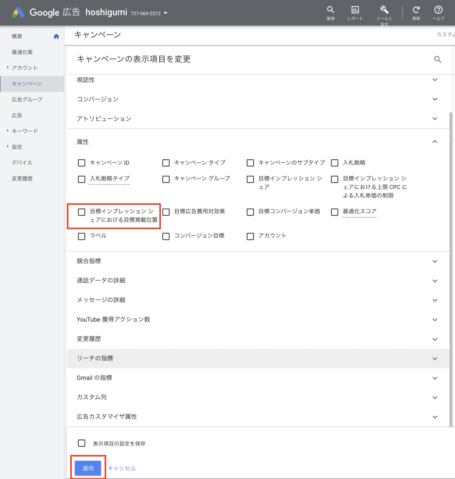 「目標インプレッションシェアにおける目標掲載位置」を選択し「適応」をクリックすることでレポートに表示されます。